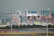 お台場フジテレビ社屋、城南島海浜公園をバックにRUNWAY16L アプローチ。このトリプル、これから私が乗る那覇行き機材のようです。