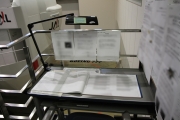この機材には電気が来ていないので、最寄りのコンセントから延長コードを介して数珠つなぎの蛍光灯を吊るして作業する事となります。シートカバーは剥がされ洗濯行き。シートのウレタンが黒々していますが、こんな感じです。