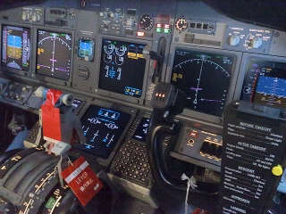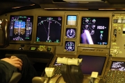 電源の入ったコックピットでは整備作業が行われていました。明日ハンガーを出るので外装もピカピカに磨かれていました。勿論客室やギャレーも。