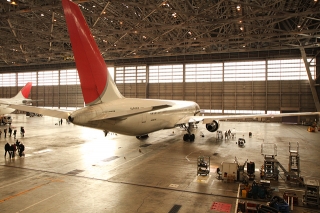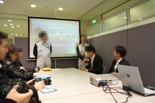 とりあえす参加者20名は数人ずつのグループに分かれ、整備さん&CAさん引率で見学開始。まず我々のグループは整備さんによる整備場のブリーフィングが行われました。
