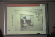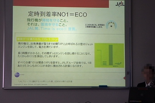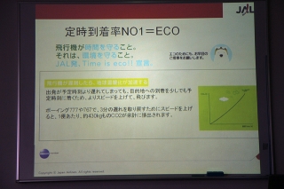 最後はエコの講義。出発が遅れ、上空で3分の遅れを取り戻すためスピードを上げると1便あたり約430kgものCO2が排出されてしまうそうです。定時到着率2年連続世界第1位のJALはエコに努めているという訳です。我々もエコを意識しつつ搭乗の際は余裕をもって早めにゲートに向かいましょう。
