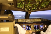 最後はダブルキャプテンが模範的な操縦を披露。20000FT上空、雲の中を飛行。と、ここで急減圧のアラートが!酸素マスクを装着し、もの凄い早さで計器をチェックしながら緊急降下を行います。