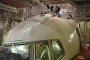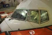 機首へ。コクピット内の機材は外されて整備中でした。窓枠には「窓のシール乾燥中」と注意書き。