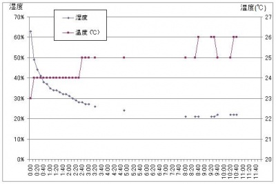 電池を使わない簡易温/湿度計にて測定。結果はグラフの通り。