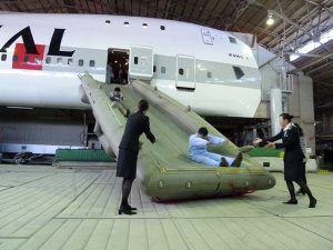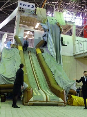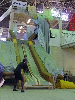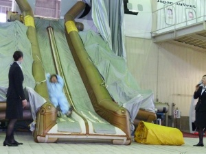 まずは教官のCAさんからスライドを滑る際の姿勢についてレクチャーを受けます。前屈みになり滑る事。滑り降りる速度は結構速いので重心を前傾にしないと、着地した時に立てなくなってしまいます。