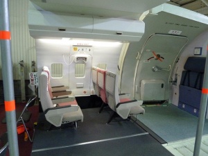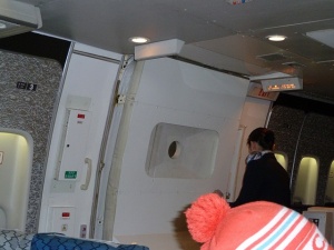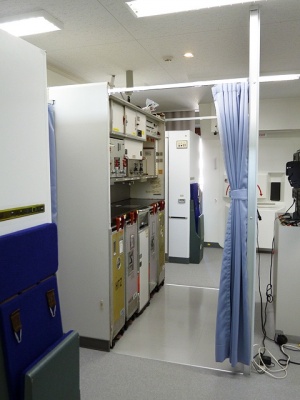 室内は実際の客室と全く同じように再現されていますが、我々の着席しているエリアから見て、前方右側のドアはB777 のNo.2ドア、左側にはB767のNo2ドアが付いています。