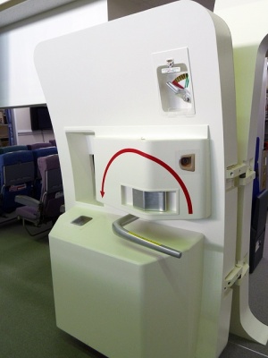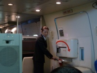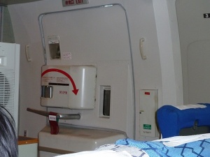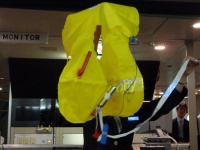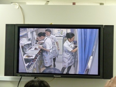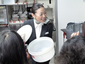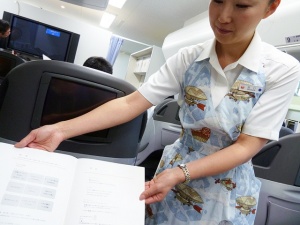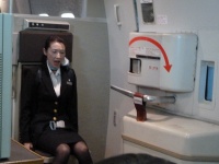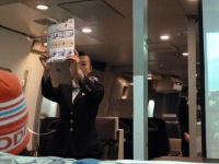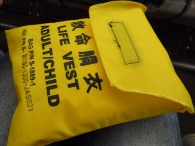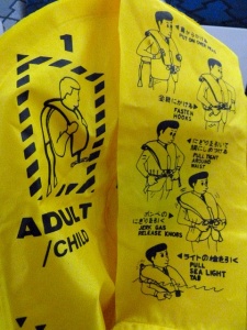 ここで教官CAから先程やった降下中の腕をクロスにする対ショック姿勢の確認とレクチャー。そして座席下にある救命胴衣を実際に広げて早着。理屈ではわかっているつもりなのですが、実際手に取り着てみるものの、裏返ってしまったり、紐の掛け方がなかなか上手くいきません。これは緊急パニック時だと更に大変なんだろうなあと思いました。