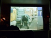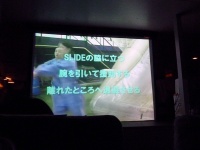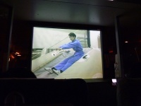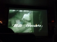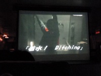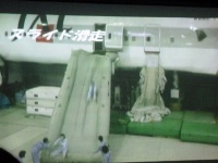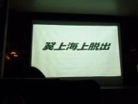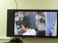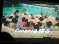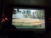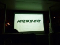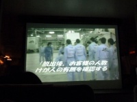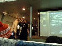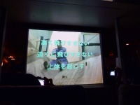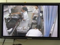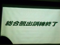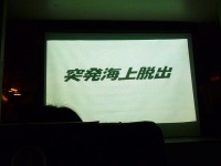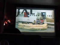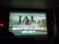 前方のプロジェクタースクリーンに緊急脱出訓練の映像が映し出されます。急脱出には、陸上に緊急着陸しスライド滑走による陸上脱出と、海上に着水しボートによる海上脱出があります。