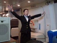 CAさんによる緊急降下着陸の実演が始まりました。サービス要員から保安要員になったCAさんは降下中、大声かつハッキリとしたした口調で乗客へ2カ国語で訴えます。