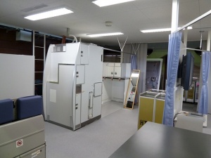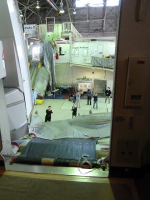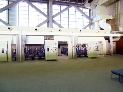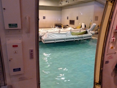 広々とした室内にドンと構えるB747型のモックアップ。Rドア側にはSLIDE RAFTが付けられています。そして反対側のLドア側はプールがあり、海上救難訓練が行なえるようになっています。