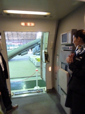 着地後、外の安全を確認してドアを開けます。ちなみにドアモードは、ドアを開けるとシューターが自動で展開するオートマティックモードです。(空港での通常着陸時は、ドアを開けた時にシューターが展開しないように、着陸後オートマティックからマニュアルモードにします)