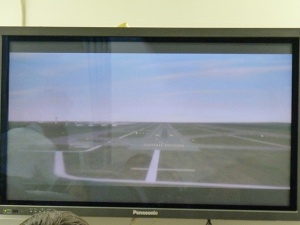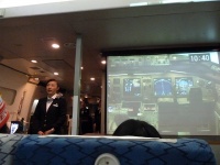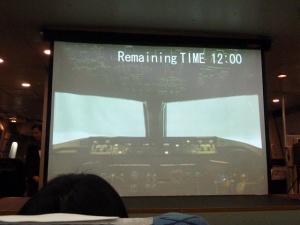 続いて海上脱出訓練の実演を行ないます。前方のスクリーンにはコクピットの映像。右上には着水までの残り時間がカウントダウンされます。着水11分50秒前、エンジンサージ。