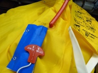 赤いタグの紐を引っ張ると一瞬で救命胴衣が膨らみます。青の保護シート内にある小型ガスボンベ2本からのガスで、左右それぞれの胴衣が膨らむのですが、私のは片方が膨らみませんでした。その際は赤いパイプから息を吹いて膨らませますが、なかなかの肺活量を必要とするようです。ちなみに救命胴衣は膨らますと足元が見えなくなるので、膨らますタイミングが大事だそうです。今回は機内で膨らませてみましたが、脱出時に足元が見えず歩きづらかったです。