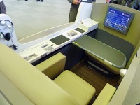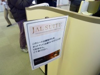 JAL SUITEファーストクラスのシートモック。ニューヨーク、シカゴ、ロサンゼルス、ジャカルタ線の各機に8席装備。ニューヨーク片道正規料金100万円だそうです。