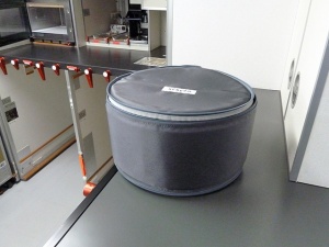 ギャレートレーニングコーナーに置かれたドラムのような黒いケース。中には白い鍋のような物が。実はこの中に米と水を入れレンジで米を炊く炊飯器なのだそうです。30分で炊きあがり15分蒸らすそうです。