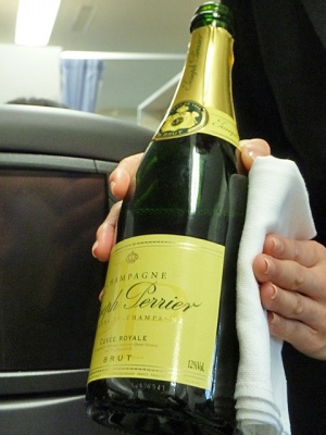 実際の機内客室と全く変わらぬサービスが開始されました。まずはシャンパンのサービスから。