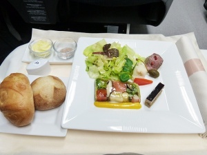 パンはメゾンカイザー。毎朝メゾンカイザーの工場から搬入され機内に搭載されるそうです。そして機内で軽く暖めて出すそうで、なるほどほんのり温かいのが嬉しいですね。