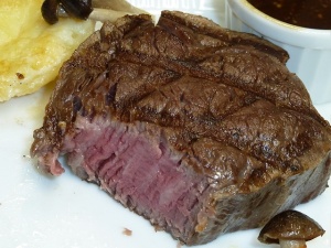マスタードソースと塩で楽しめます。肉は生で搭載しギャレーで調理。焼き具合はイイ感じでナイフでスーッと切れる程非常にやわらかく美味でありました。