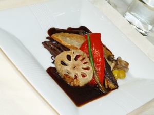 こちらもお隣の方の洋食魚コースのメインディッシュ。「イトヨリ“巣籠”スタイル バルサミコソースと共に」
