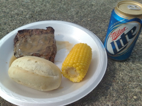 まずはステーキとハンバーガー、色水(ゲータレード)でスタート。今回のステーキはソースがかかっていました。ハンバーガーはいつも通り、ケチャップとマスタードとピクルスはセルフで。