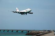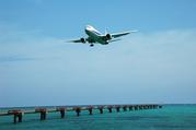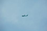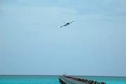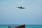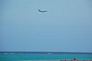 青空とエメラルドグリーンの海にジャンボ、滞在5日目にしてやっとその時が来ました。真青な空ではありませんが…まあいいでしょう。それにしてもデカい。。。
