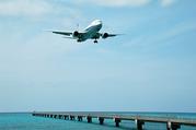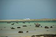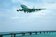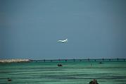 「伊良部島」から見た「佐和田の浜」と「下地島」。空港上には離陸前のANK B737-500